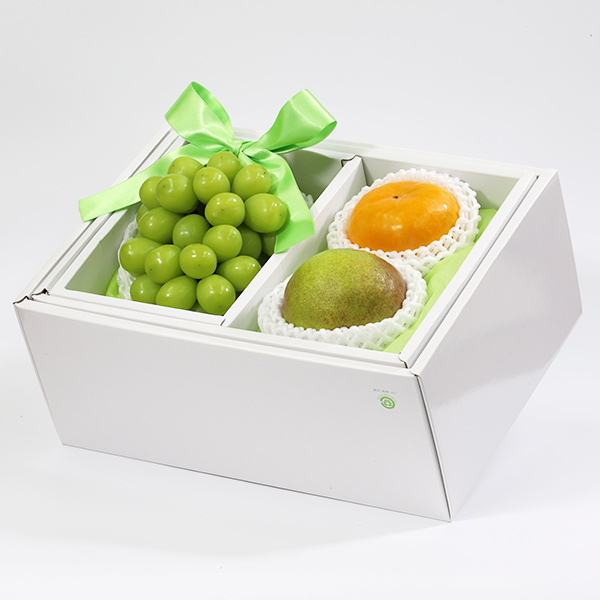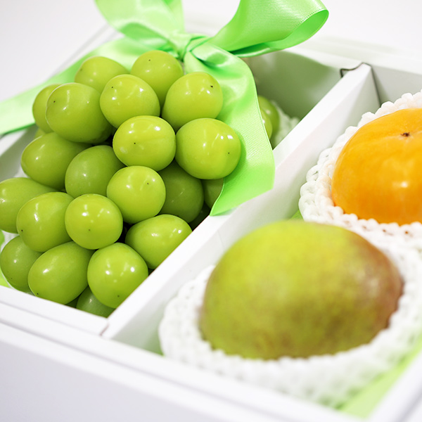 皮ごと食べられて甘い「シャインマスカット」と、なめらかな食感が美味しい「西洋梨」、甘くてコリッとした「次郎柿」のアラカルトギフトです。