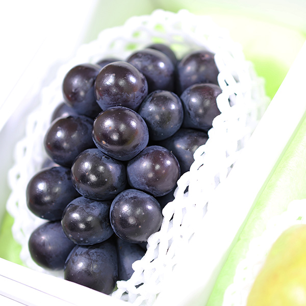 見た目は、ピオーネや巨峰のようですが、「皮ごと食べられる」のが特徴の黒ぶどうです。巨峰を親に持つので、濃厚で甘い巨峰のような味のまま、皮ごと食べられるという嬉しいぶどうです。