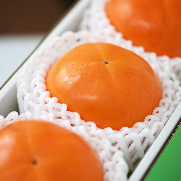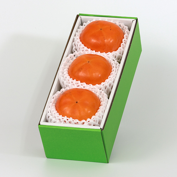 遊び心も兼ね備えた、品質も食味も抜群のこの柿を3玉選果実してお送りします。
